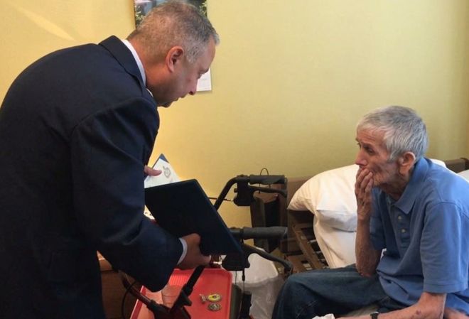 ▼拉夫齊亞近日穿著整齊的軍裝,帶著褒獎令、單位徽章和紀念幣到療養院拜訪勞倫斯,並告訴他「你在越南和空軍中的任務已經完成了,不需要再擔心這個問題」,讓勞倫斯終於放心心中的大石。