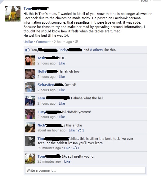 ▼2. 「我是Tom的媽媽,我想告訴你們,Tom今天做了一個非常不好的決定,所以被禁止用臉書。他在臉書上散佈別人的個人隱私,不管內容是否正確,這倒是很不禮貌的。他這樣做是為了讓那個人生氣,我想是時候讓他知道這是一種怎樣的感覺了:Tom一直到14歲還會尿床!」