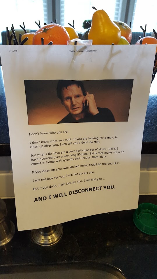 ▼1. 「我不知道你是誰,也不知道你想要什麼。如果你期待女傭過來幫你打掃衛生的話,我可以告訴你,我不會那樣做。但我有非常特別的技巧,這是我用一輩子學會的技巧。這個技巧讓我變成無線網路與手機數據專家。如果你用完廚房後收拾乾淨,一切都會結束,我不會找你,也不會追蹤你。如果你不這樣做,我會找到你,然後讓你斷線!」