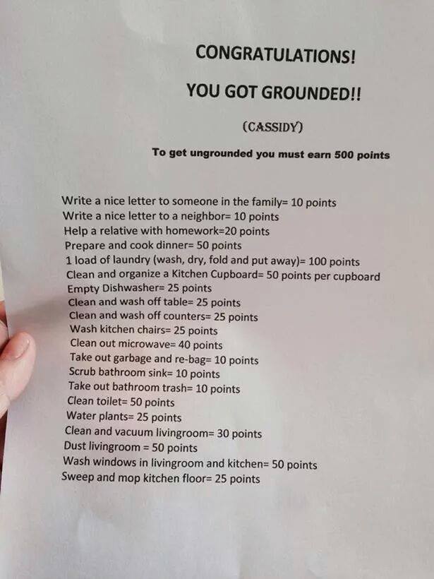 ▼9. 女兒被禁足後,媽媽整理了一張得分表,她得到500點才能出門。裡麵包括:「幫助親戚做功課、準備晚餐、清理廁所…」