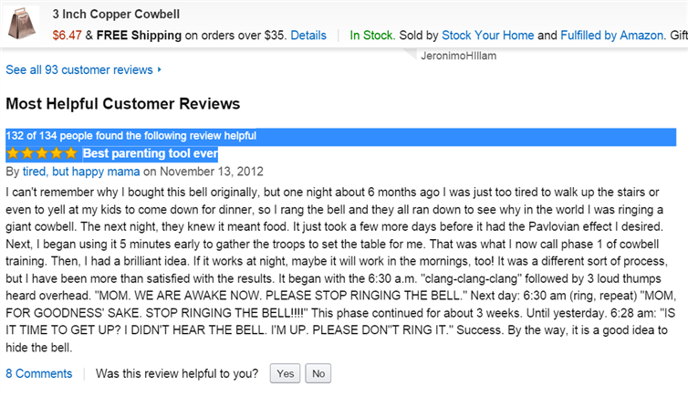 ▼11. 之前媽媽亂買了一個超大聲的手搖牛鈴,在她的訓練下,只要她一搖鈴,小孩就知道下樓吃飯,還會幫忙擺餐具。早上她一搖鈴,小孩就知道該起床了,後來因為害怕鈴聲,他們還會主動早起。