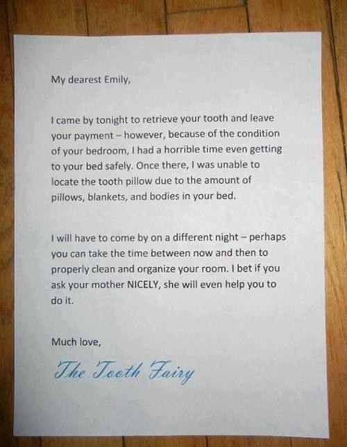 ▼13. 「親愛的Emily,今晚我到你的房間來拿你的牙齒,還想留下獎勵。但是你的房間太亂了,我都沒法安全走到你的床前,更沒辦法找到你藏牙齒的枕頭,因為你的床上有太多枕頭和毛毯了。我會另外找過晚上拜訪,也許你可以抽空打掃一下房間。我想如果你好好拜託一下媽媽,她會很樂意幫忙的。愛你的牙仙子。」
