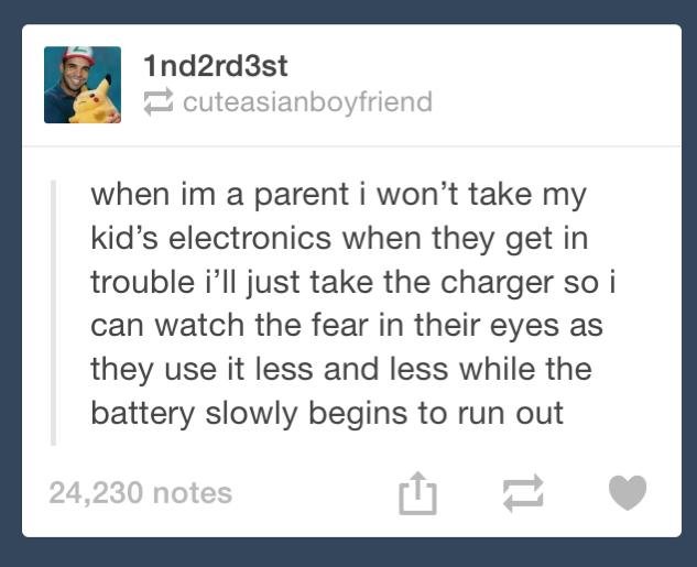 ▼15. 「如果我有了小孩,不會沒收他們的電子產品當做懲罰。我會沒收充電器,這樣就能看到他們在電子產品快沒電時,眼睛里流露出的恐懼。」
