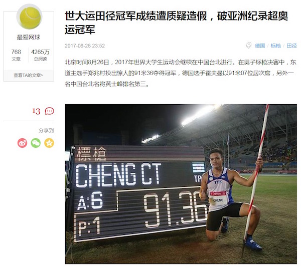 2017年08月31日台灣的標槍好手鄭兆村在世大運擲出91.36公尺的紀錄,風光摘金,還打破中國選手趙慶剛的亞洲紀錄,對於這項成就,陸媒和陸網友卻質疑此項紀錄「造假」,鄭兆村則霸氣回應:「下次比賽見!」