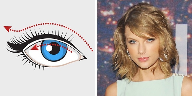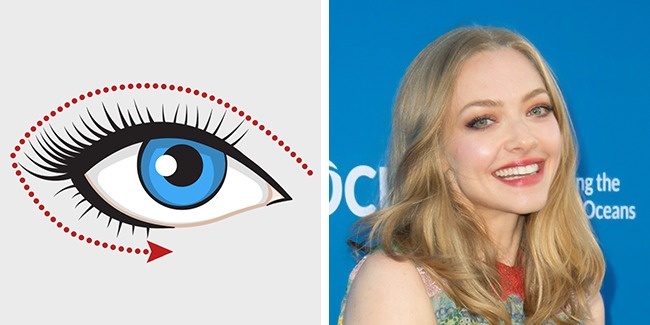 ▼細長眼:這樣的眼睛很性感,畫眼線的時候要小心一點,避免讓眼睛看起來更窄。先用白色眼線在眼瞼和睫毛之間上色,然後用黑色眼線強調上挑的外眼角,後半段眼線加粗。
