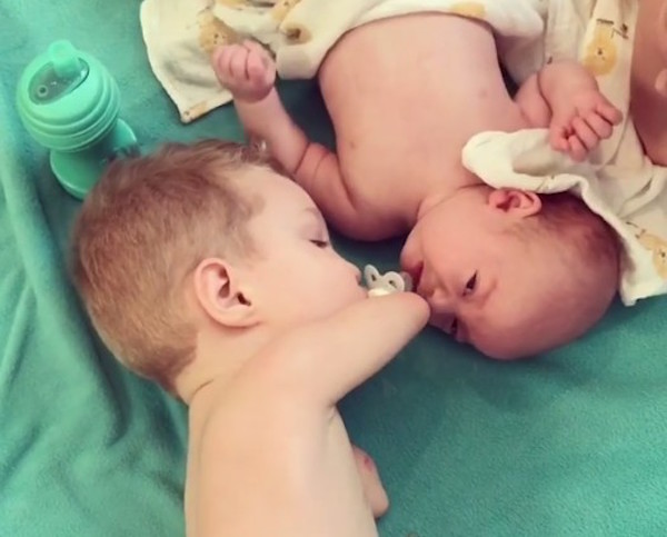 ▼凱蒂說,當剛出生不久的弟弟在沒有奶嘴而哭鬧時,年僅4歲的卡姆登就對她說:「我來搞定!」然後努力扭動身體,手口並用,把奶嘴塞到弟弟嘴裡。
