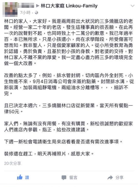 ▼不久後,老闆又再度在臉書上表示,店內已經經過排水管封網、切肉區內外全封死等工程,小生物再也進不來。另外,之後消毒公司會來簽約點藥、封閉排水溝、重新裝潢、加裝兩組靜電器、兩組油水分離槽等,預計會重新開業,餐點一律特價50元,也歡迎所有人進來店內指正,提供改進建議。