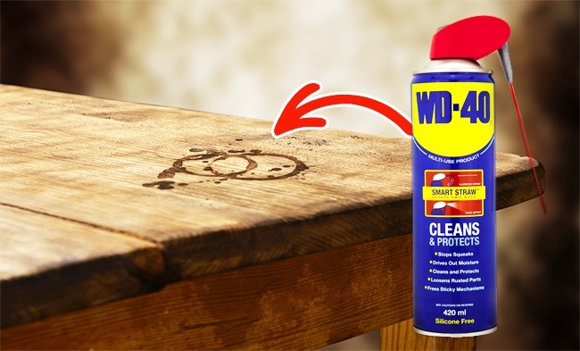 木頭桌表面的茶漬跟咖啡資再也不會是一個問題了,只要你在抹布上噴上多用途潤滑防鏽蝕用製劑-WD40就能夠輕鬆的去除!