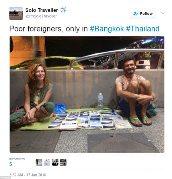 ▼這是近幾年在東南亞地區常見到的怪象,許多歐美白人會站在路邊,舉著「我在亞洲旅遊,但沒有旅費,請資助我的旅行」的牌子乞討,靠著好心人的施捨,來無償換取自己的旅費。