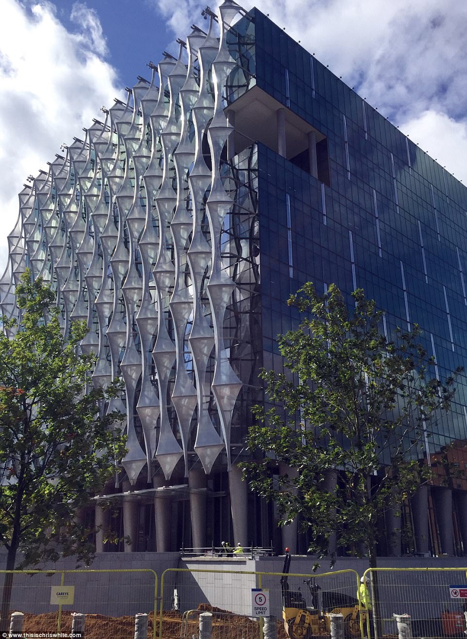 ▼新大使館總共12層,佔地面積4.5萬平方米。在外部設計上也採用了防彈玻璃材料,但輕質塑膠纖維的材質又給人柔和的感覺,就像船帆一樣。
