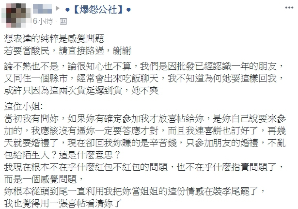 結婚喜宴邀請朋友出席,本來是一件喜氣洋洋的開心事,不過如果因為發喜帖而導致兩個朋友之間的友誼破裂,那就有點可惜了。日前有一名女網友在臉書《爆怨公社》上抱怨,表示自己將喜帖發給一個做批發時認識的「姐姐輩」朋友,兩人平常交情不錯還經常一起吃飯聊天,沒想到對方在答應出席她的婚禮之後,不僅出爾反爾還口出惡言,女網友非常憤怒。