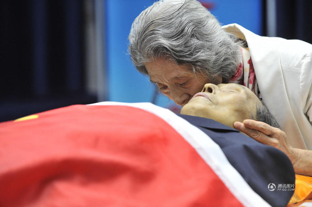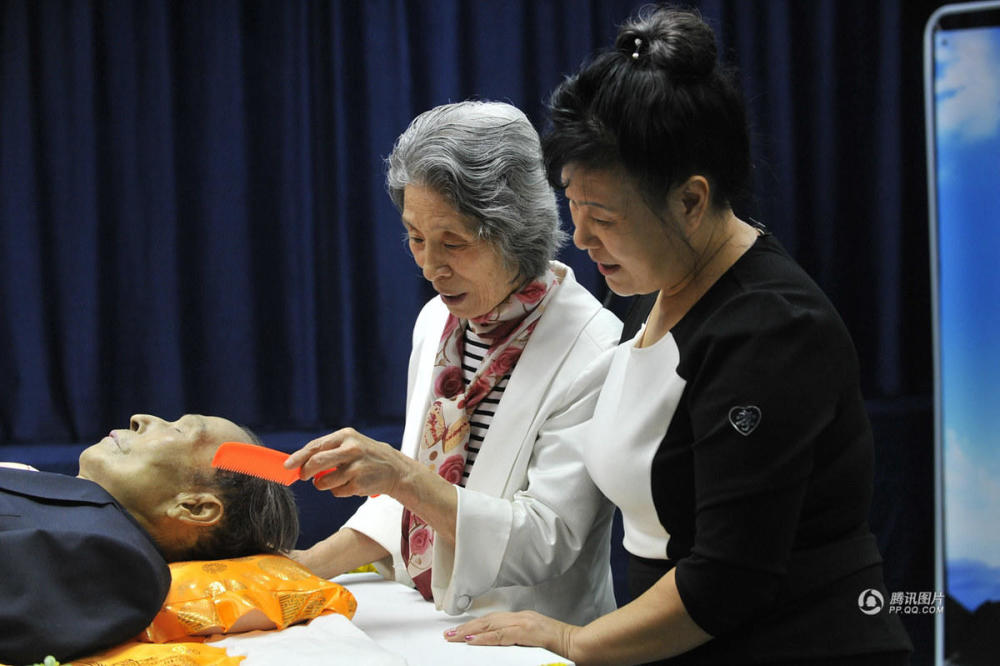 ▼在告別儀式開始之前,心細的大女兒不時為老人整理遺容,還小聲說:「大家都在等著你呢,很多人都還需要你… …」說完還親吻了父親的額頭。老人的妻子則拿來梳子為他梳頭髮,並說:「你為更多人點亮了光明,新生等著你……」