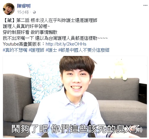▼網友陳睿明在臉書和Youtube上傳一段公開影片,指出他前日帶阿公去醫院,稱呼護理師「護士」卻被兇,讓他憤而拍片上傳,表示:「根本沒人在乎叫妳護士還是護理師,護理人員真的好辛苦喔~穿的制服好看,做的事情懶散,我不出來嘴一下,還以為台灣護理人員都是這樣勒~」