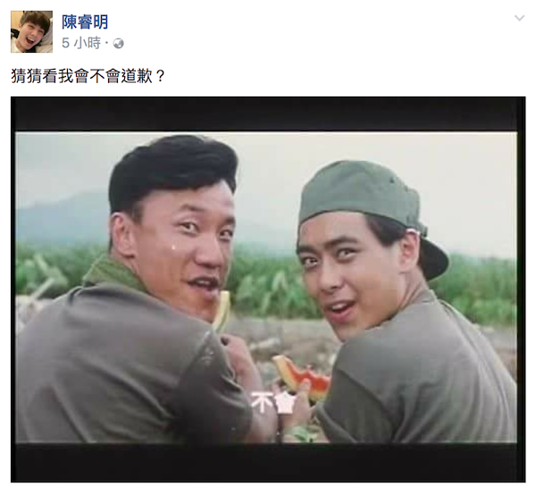 ▼雖然事件引發軒然大波,但陳男似乎還是不為所動,稍早又在臉書回應說:「猜猜看我會不會道歉?」並附上圖片,表示自己絕不道歉。
