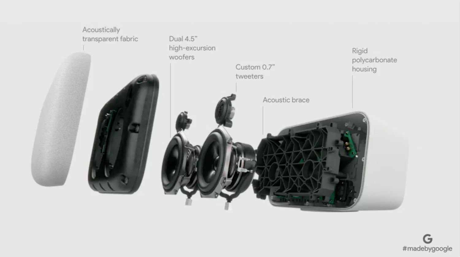 ▼配備了兩個4.5吋的低音單體喇叭、兩個高音單體喇叭的Google Home Max,提供了比普通Google Home強20被的音量輸出,同時搭配了Google新開發的「Smart Sound」技術,能透過聲音辨識周圍環境,讓最佳的聲音效果充滿整個房間,同時在音樂很大聲的情況下也能夠接受使用者的語音指令。