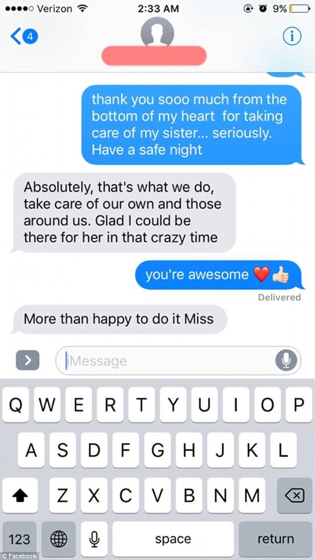 ▼後來她給Brendan傳簡訊表達了自己的謝意:「從心底感謝你照顧我妹妹,真的。祝你度過一個安全的夜晚。」