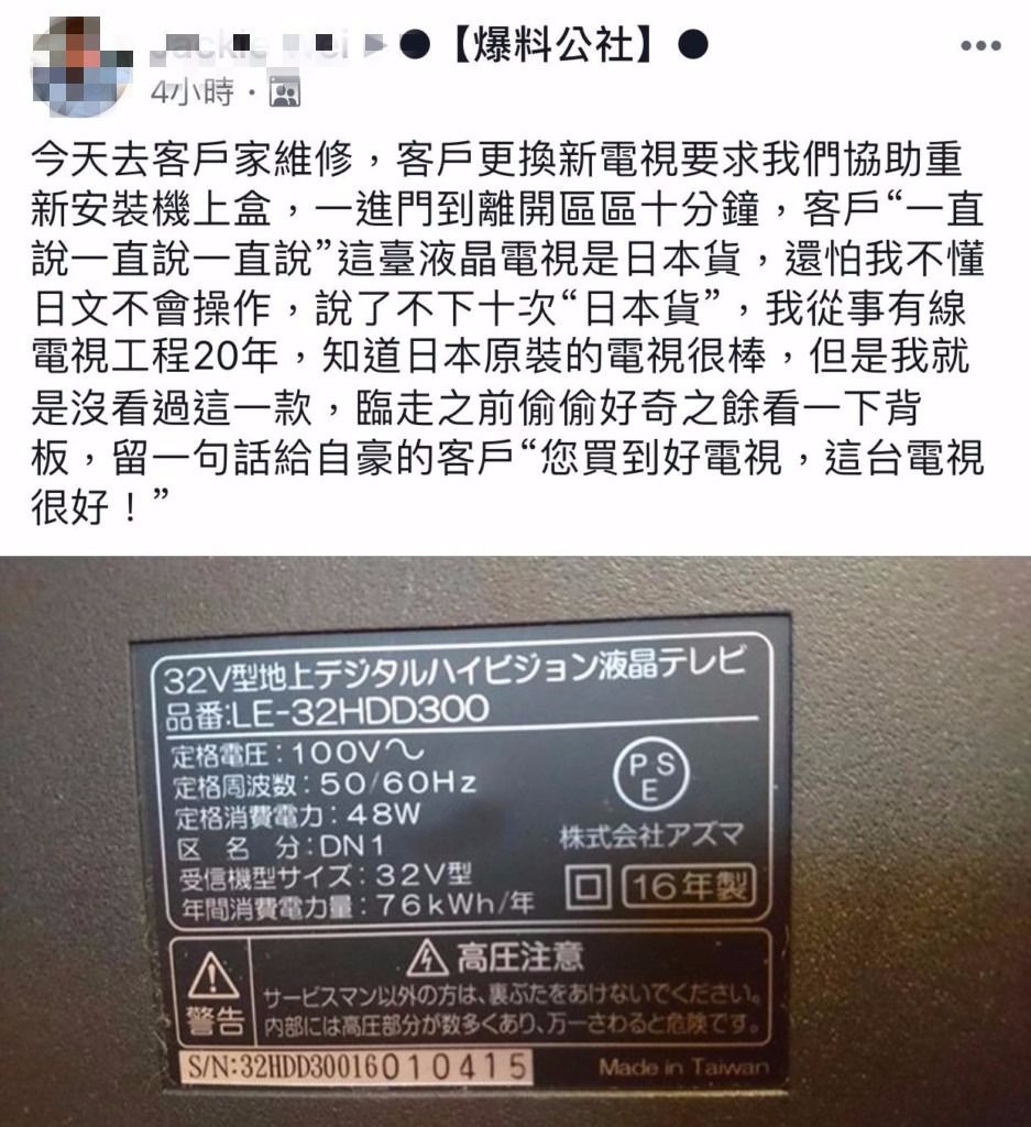 ▼網友說客戶裝新電視,要求他們過去重裝機上盒,結果一進門區區十分中,客戶就說了不下十次「這台液晶電視是日本貨」,還怕他不會日文無法安裝。他從事電視工程20多年,卻從沒看過這一款,就好奇看了一下背板,才忍笑跟自豪的客戶說:「你買到好電視,這台電視很好!」