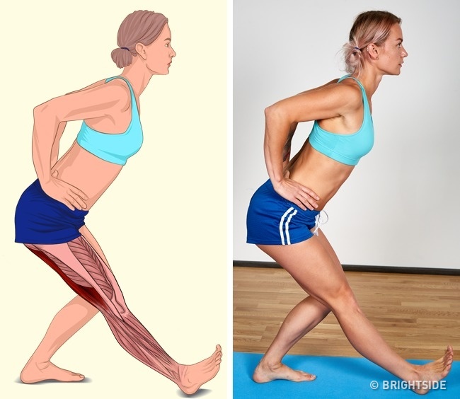 ▼後腿肌肉和肌腱:後背挺直站立,雙手放在腰部,右腳前伸,左膝彎曲,身體前傾。拉伸完畢後換另一邊。