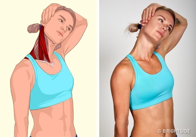▼胸鎖乳突肌和上斜方肌:後背挺直,左手放在右耳附近,慢慢向左歪頭,試著用左耳碰左肩。拉伸完畢後換另一邊。