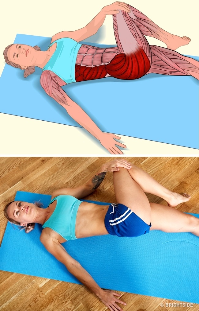 ▼臀大肌和腹外斜肌:仰躺在地,彎曲右膝,將右腿歪向身體左側,用左手輕輕按壓。拉伸完畢後換另一條腿。