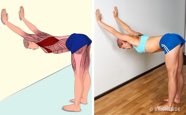 ▼胸肌和背闊肌:在牆前站立,與牆壁保持半身的距離。彎腰後雙手支撐牆壁。
