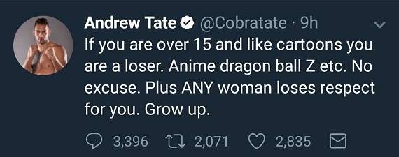 2017年10月08日很多人覺得漫畫、動畫是小孩子才看的東西,認為看這些的大人「不正常」。最近,職業拳擊手Andrew Tate就在推特上說:「如果你已經超過15歲還愛看動畫,你就是魯蛇。像是《七龍珠Z》什麽的,別找藉口。任何女性對你們這些動畫宅都不會尊重的,快長大吧屁孩。」