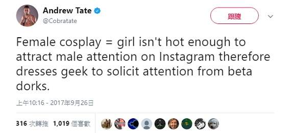 ▼他好像覺得火還不夠大,繼續說:「女Coser就是不夠正不夠辣,無法在Instagram上吸引男人關註,才會用穿奇裝異服的方式來吸引魯宅的註意。」