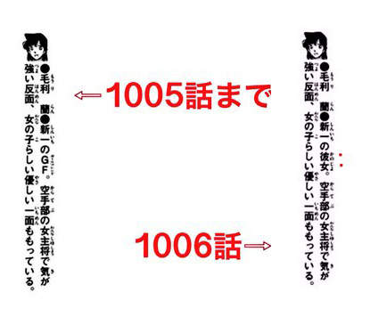 ▼在1006話中,最右側關於小蘭的介紹終於改變了,變成了「新一の彼女」。