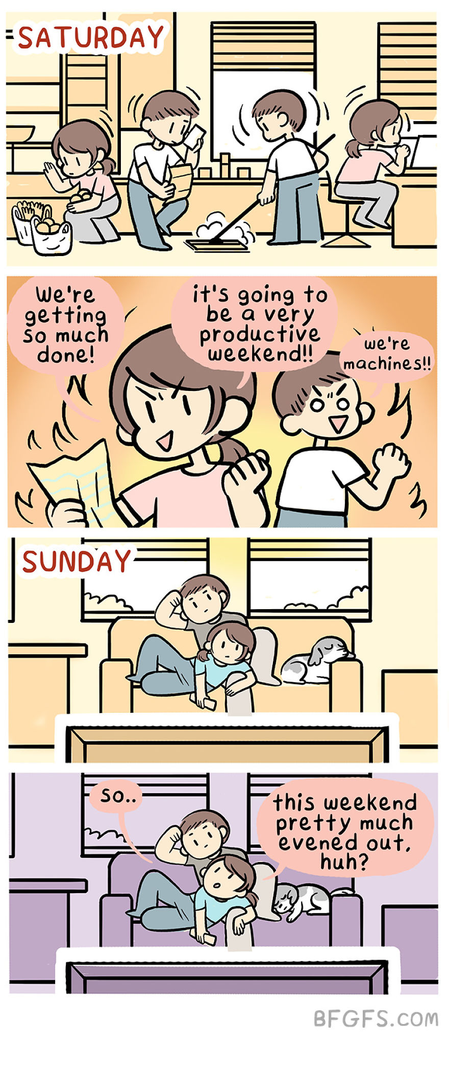 女:「我們幹了這麼多活,這個週末很充實!!」