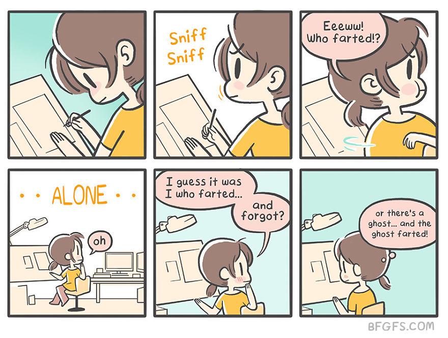 ▼​15.女:「誰放屁了?!難道是我放屁後忘記了?或者這裡有幽靈,幽靈放屁了!」