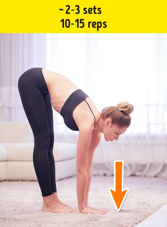 站立時腳與肩同寬,向前彎曲時膝蓋不彎曲,嘗試將手碰到地板。