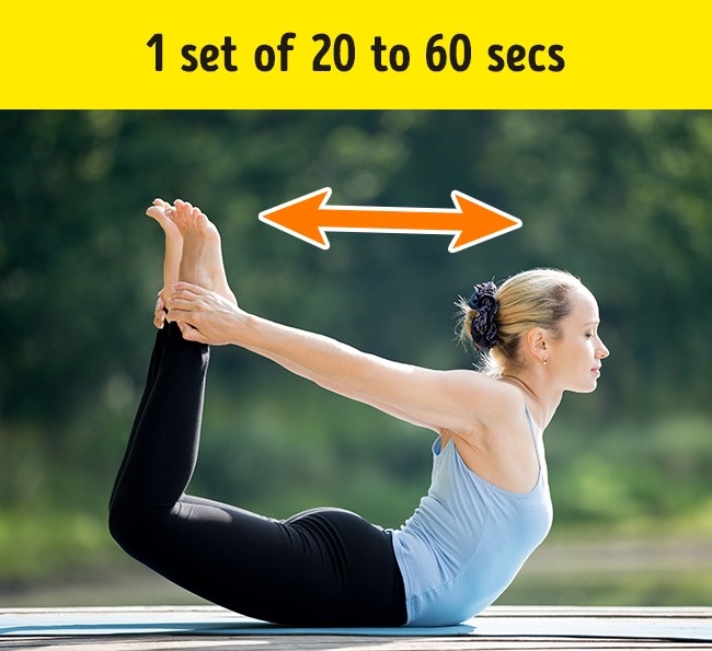肚子向下趴著,吸氣之後彎曲背部,將頭部和手腳同時抬起,用手抓住腳踝,維持一定秒數之後呼氣,放鬆肌肉,回到初始位置。
