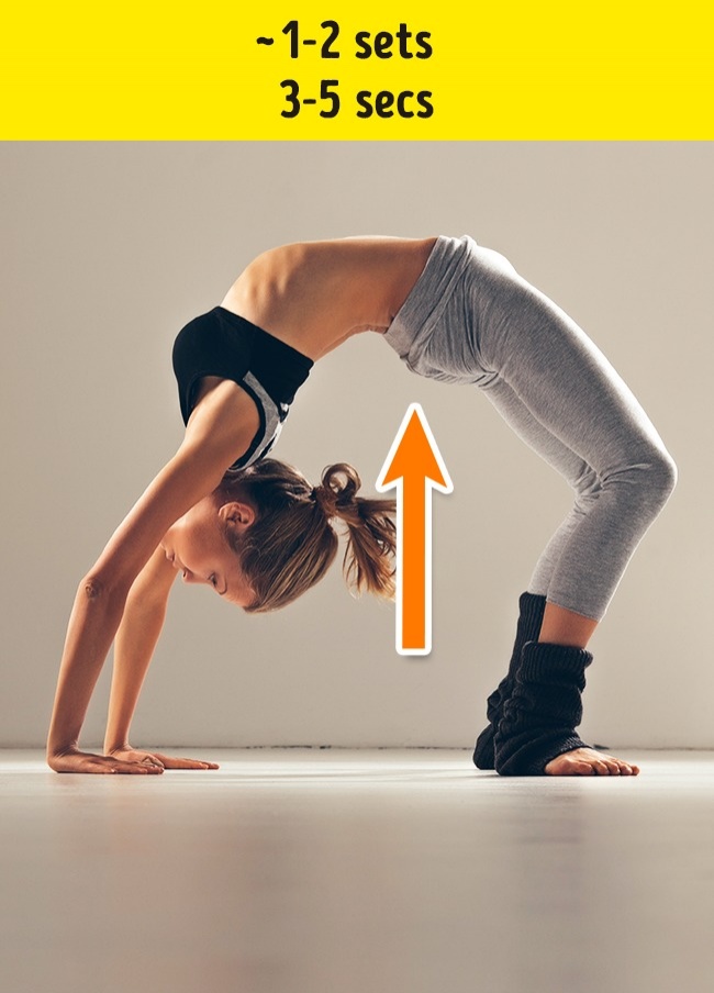 這個動作雖然對背部肥胖紋很有效,可是不太適合新手,建議經過一些基礎動作之後才開始這個動作。首先背部靠地躺下,雙腿與膝蓋呈直線,將手掌放在頭部上方一些的位置,先輕輕提起臀部,接著到肩膀,讓背部彎曲,維持數秒之後輕輕地將背部放回地面上。