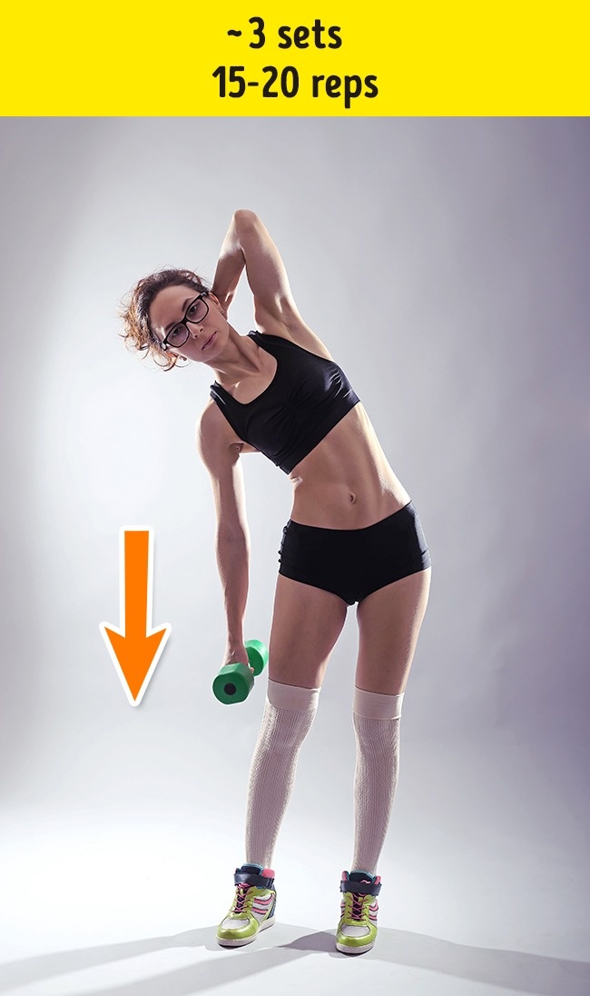 站立時腳與肩同寬,舉起一隻手將手掌放在頭的後方,另一隻手舉起啞鈴,身體向啞鈴處稍微彎曲。