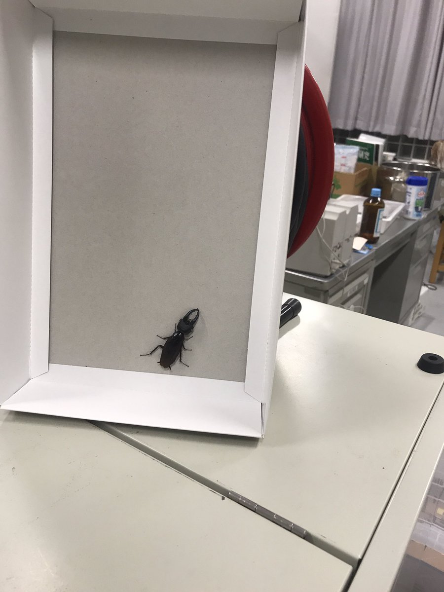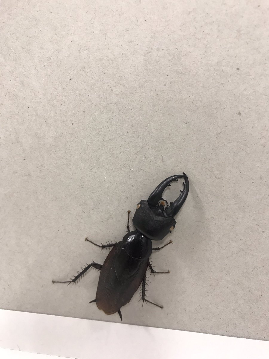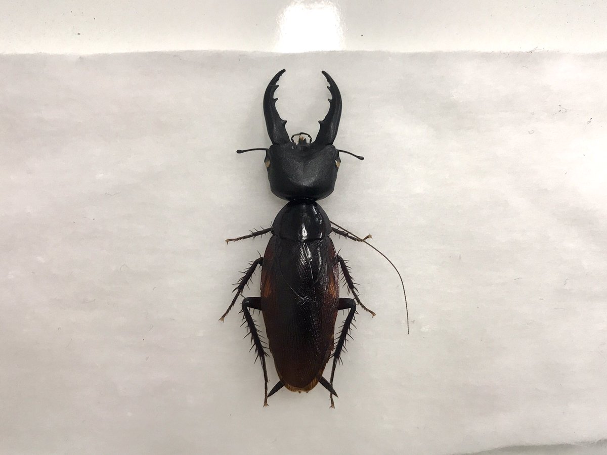 ▼仔細看看,似乎有什麼不對……原來這隻蟑螂頭上的大螯有問題。@r_sato55弄清楚情況後解釋說,學生在生物教室做的標本沒處理好,變質引來了蟑螂。蟑螂的嘴器和鍬形蟲的頭部標本卡在了一起,就變成了新品種,把學生們都嚇到了。