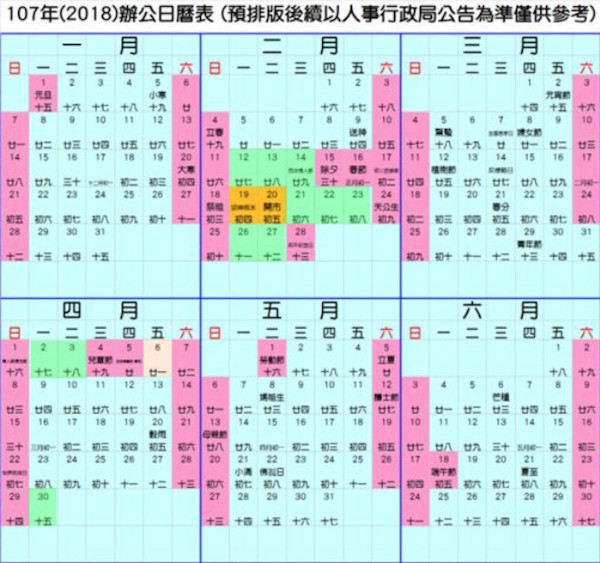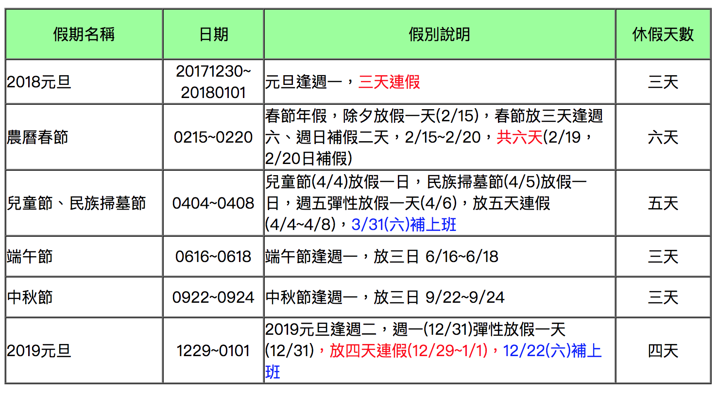 ▼以2018上半年來看,如果好好規劃,就可以有許多連續假期!以下綠色就是建議的請假日: