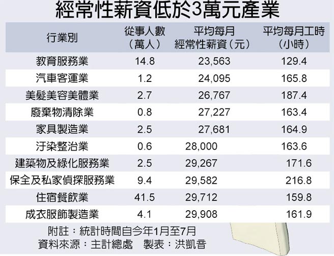 ▼主計處統計,全台平均月薪(經常性薪資)最低的10大行業,大多屬於服務業。這些行業的從事人數共有83萬人,但薪資水平遲遲無法跨過3萬元!