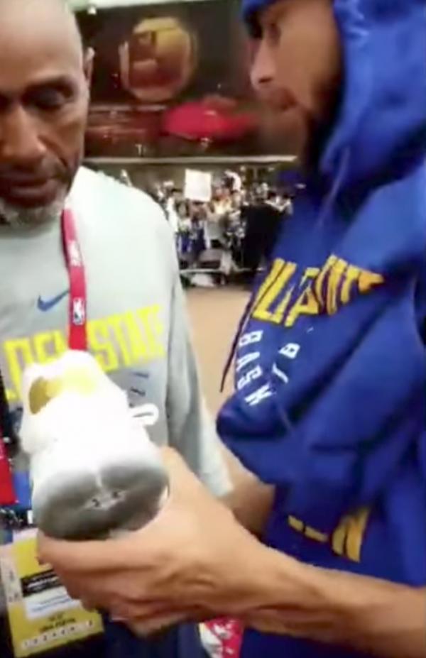 ▼柯瑞不僅將球鞋拿來仔細端詳,連鞋底也仔細地檢查了。