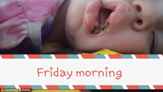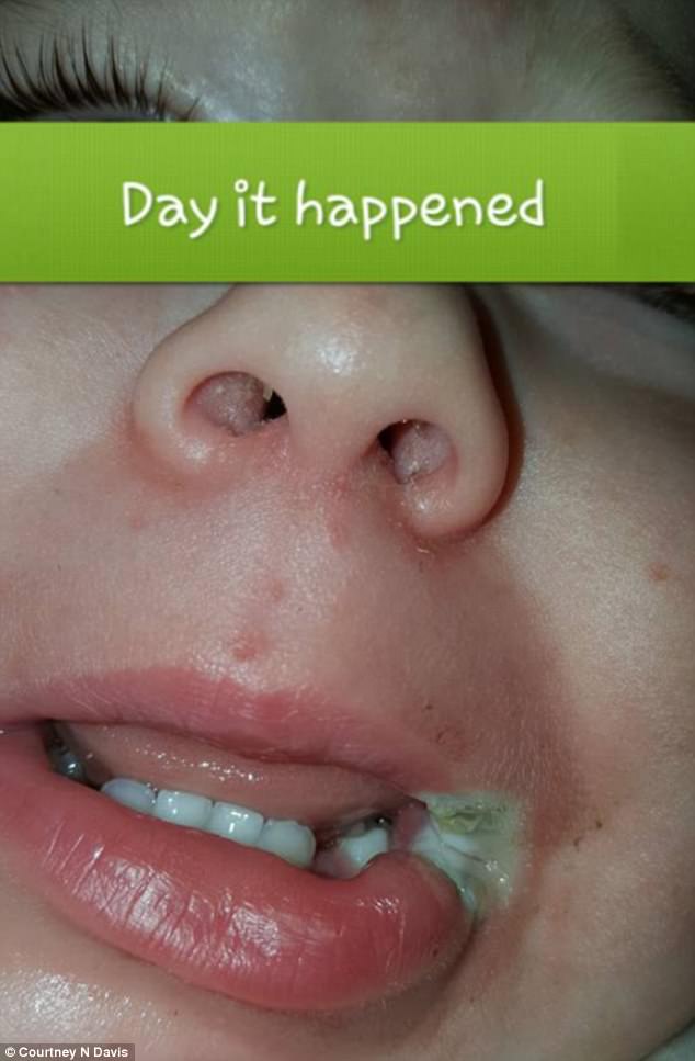 ▼戴維斯將女兒嘴角傷口的傷勢拍照記錄下來,以此警惕其他的父母千萬要小心。這是隔天起床之後的傷口: