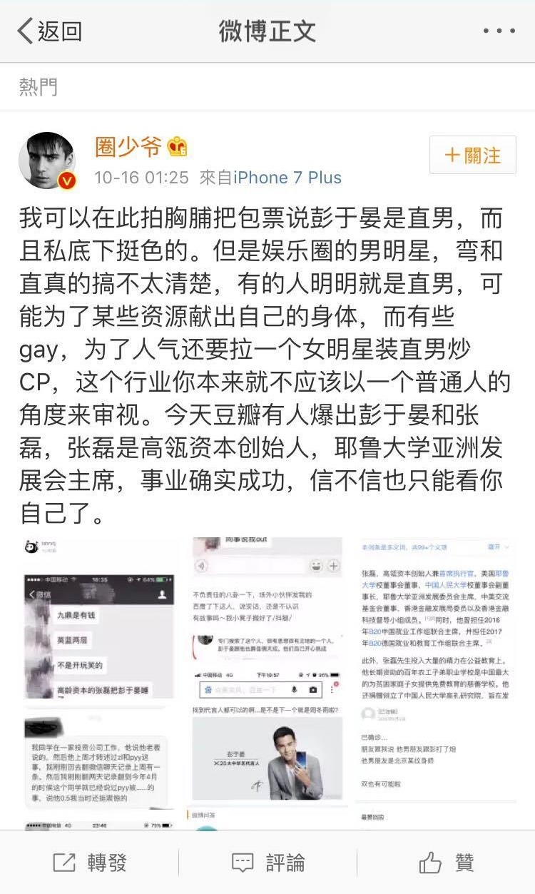 ▼就在10月16日的凌晨1點25分,這個專門爆料八卦新聞的微博帳號「圈少爺」po出了一則震撼彈,表示娛樂圈有些藝人雖然是直男,不過為了資源還是願意「獻身」,同時分享了多張的對話截圖,證明「彭于晏真的為了好處而被張磊睡了」。