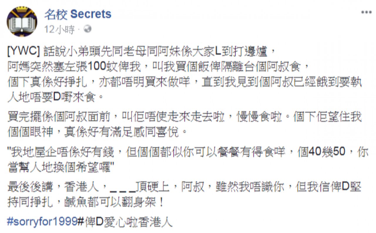 2017年10月19日前幾天,一名香港網友在臉書專頁「名校Secrets」分享了自己的經歷。那天他與媽媽、妹妹一起到速食店吃飯,期間媽媽突然塞給他一百塊紙幣,讓他給鄰座的叔叔買飯吃。原PO不明所以,轉過頭看時才發現,那位叔叔正在吃別人剩下的東西。