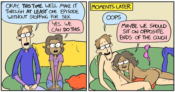 「也許我們應該坐在沙發兩端。」「對啊。」