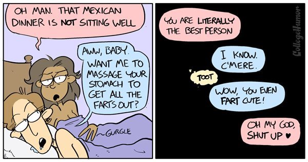 「我的腸胃不太適合墨西哥菜。」「噢,寶貝,要我幫你揉揉小肚子,把所有的廢氣都排出來嗎?」