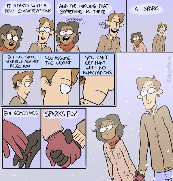 ▼1.愛情總是在不經意間到來。剛開始你們只說了幾句話,就感覺到了異樣的情愫,還有愛的火花。你做了最壞的打算,哪怕被拒絕也沒關係,想愛就不要怕受傷。但勇敢一點的話,說不定會有好結果呢。