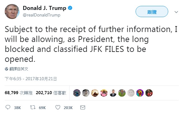 2017年10月23日歷史上著名的懸案:美國總統甘迺迪(John F. Kennedy ,簡稱JFK)被暗殺一直都被許多人津津樂道,也是許多人一直都在關心的疑問。不過這個疑問似乎有機會得到解答,因為現任美國總統川普(Donald Trump)10月21日時在推特上表示,將會准許公開相關的機密文件,讓人們更加了解這件事情的始末!
