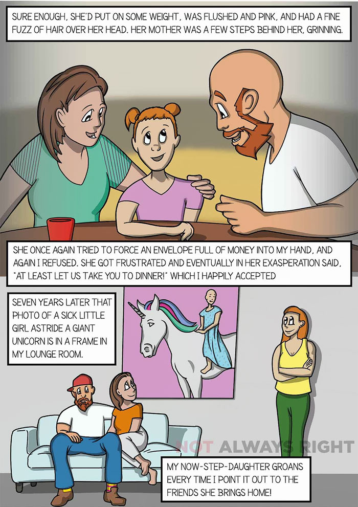 ▼她很無奈,最後說:「那至少讓我們請你吃頓飯吧!」這次攝影師沒有拒絕。7年後,生病小女孩騎在獨角獸上的照片掛在了攝影師的休息室裡,小女孩已經成為了他的繼女,每次她帶朋友來玩,攝影師都忍不住把這個故事說一遍。