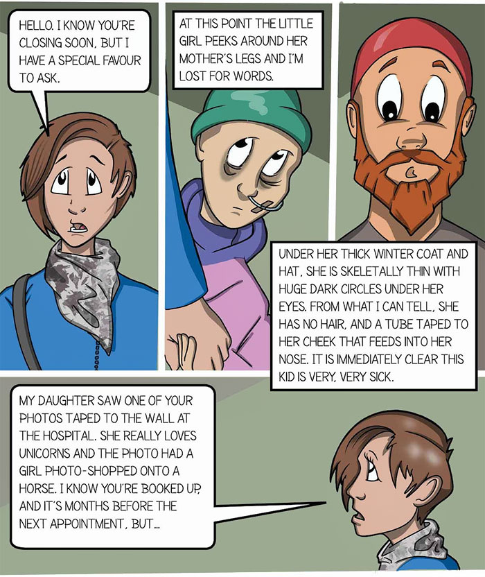 那位媽媽強忍著眼淚說:「我女兒在醫院的牆上看到了您拍的照片。她很喜歡獨角獸,那張照片中,一名小女孩騎在獨角獸上。我知道想請您拍照需要提前預約,但預約後還要等好幾個月……」