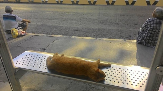 ▼貓咪睡得很香甜,等車的人不想打擾,只好坐在路邊。