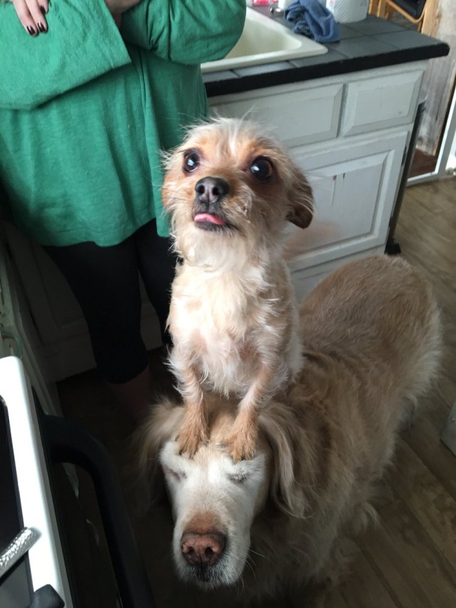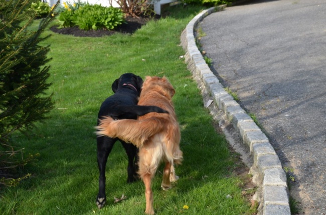 ▼狗狗的擁抱,牠們的感情一定很好。
