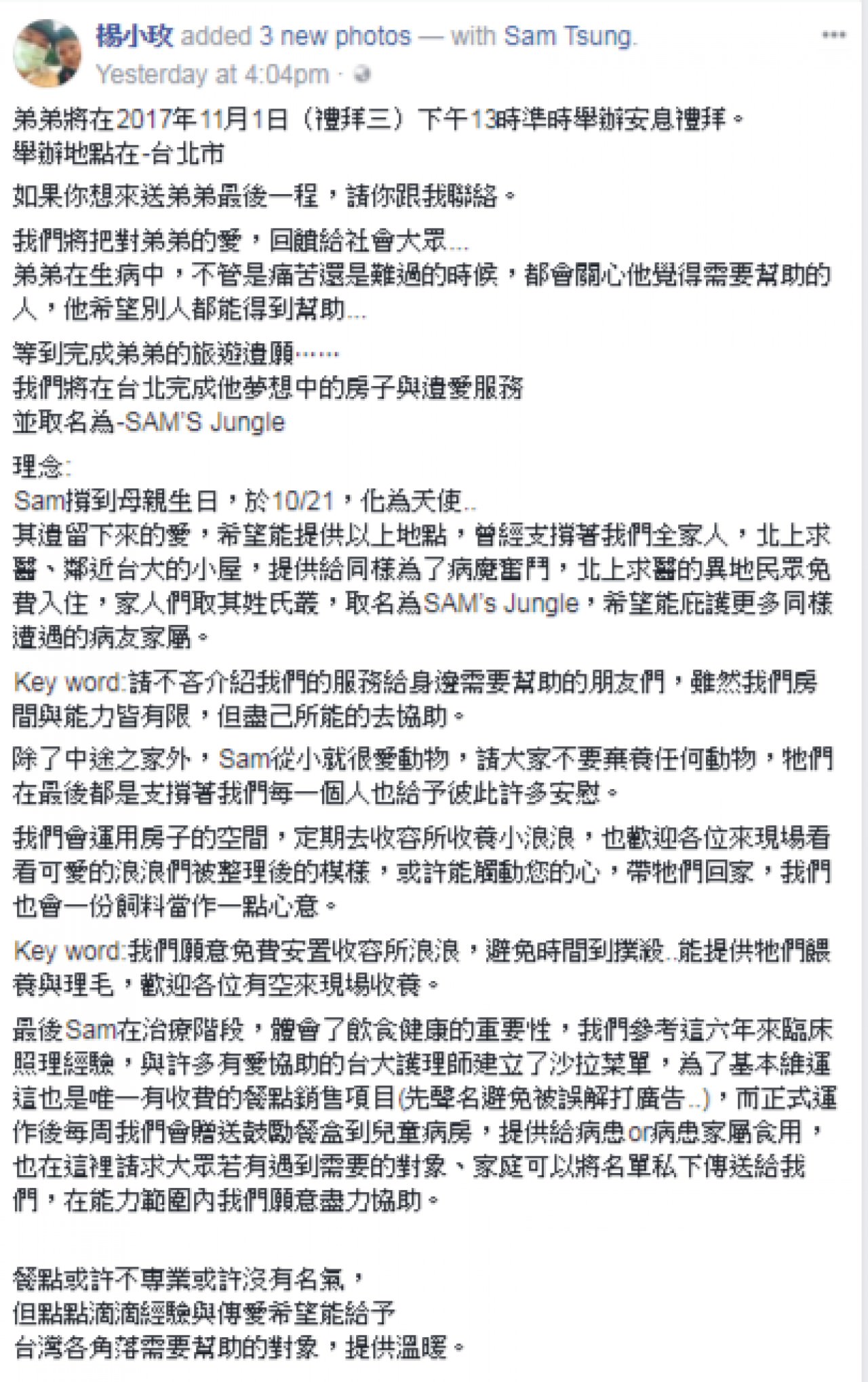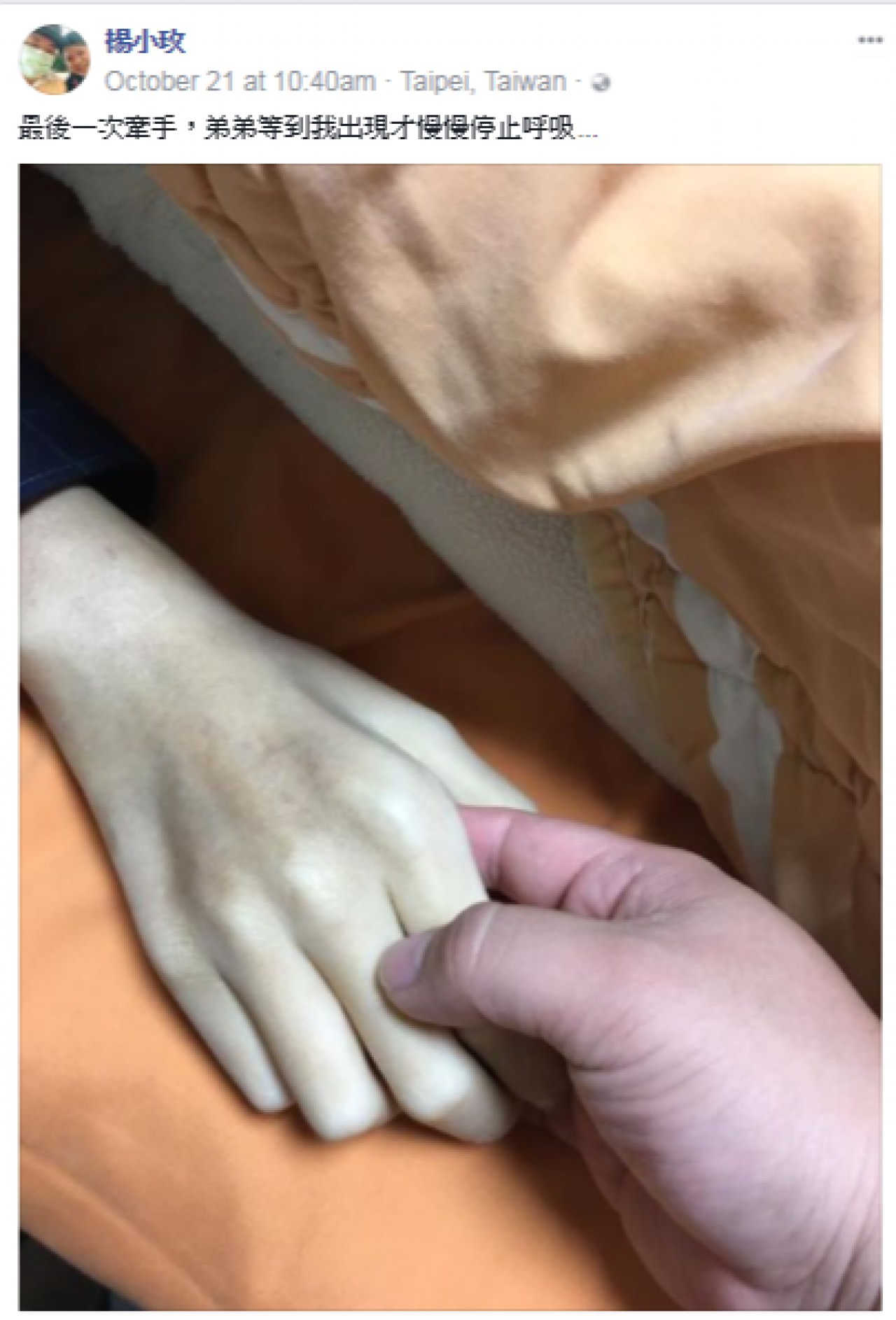 ▼楊姓網友也在日前公布弟弟死訊,緬懷說弟弟即使病危,還是會關注需要幫忙的人,所以她和家人決定把這份愛傳下去,「曾經支撐著我們全家人,北上求醫、鄰近台大的這間小屋,提供給同樣為了病魔奮鬥,北上求醫的一地民眾免費入住。」
